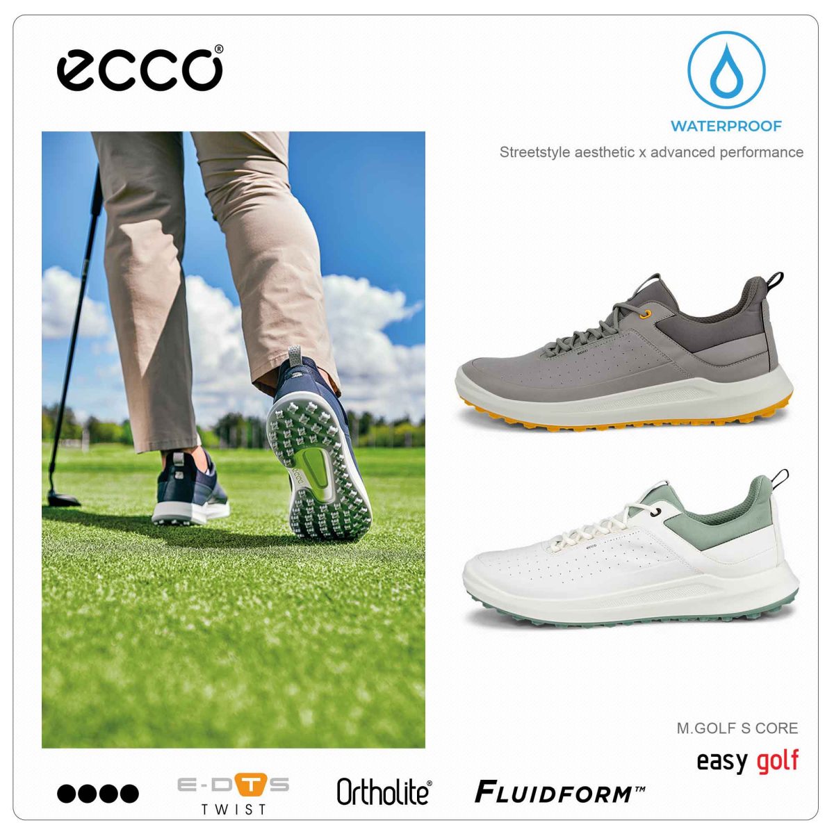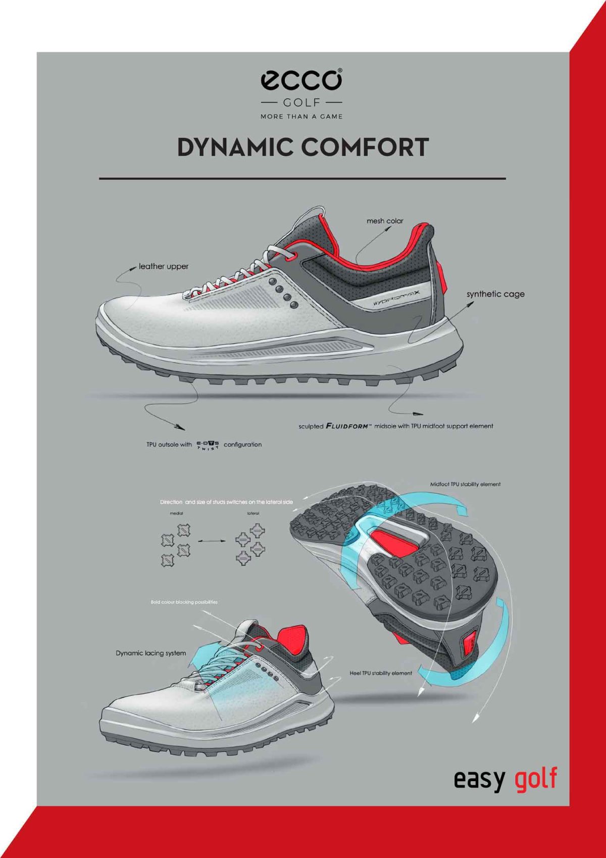 The ‘sneaker’ like shoes feature a fresh, premium mix of ECCO technologies, with different textures and perforations on the upper. The unique design of the E-DTS TWIST outsole offers multi-directional traction and has slightly larger cleats in high-abrasion areas. A lightweight sole provides cushioning and flexibility in the shoe, using innovative ECCO FLUIDFORM Direct Comfort Technology.