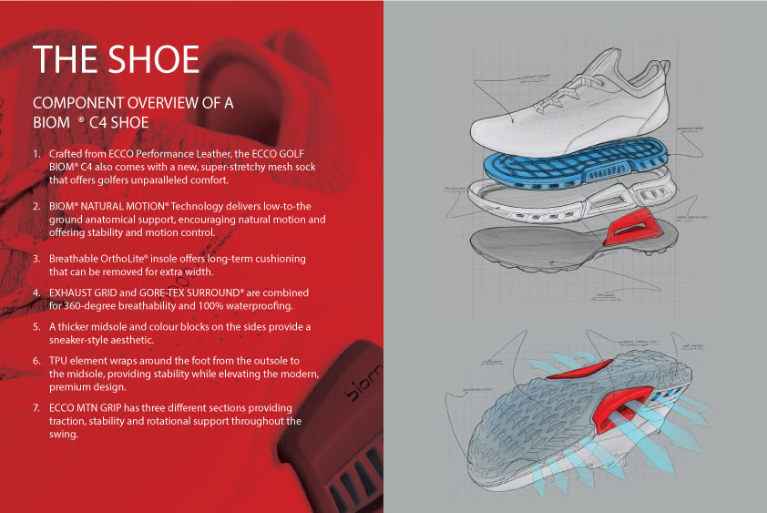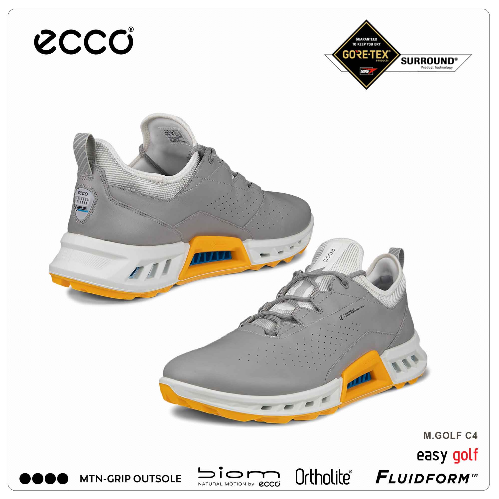 • รองเท้ากอล์ฟไฮบริดสำหรับผู้ชายมีโครงสร้าง GORE-TEX SURROUND ที่ระบายอากาศได้ 360 องศาและกันน้ำได้ 100% ซึ่งผสมผสานกับ ECCO EXHAUST GRID ที่ช่วยระบายอากาศไปยังฝ่าเท้าของคุณ พื้นรองเท้าชั้นนอก ECCO MTN GRIP แบบก้าวหน้ามีสามส่วนที่แตกต่างกันซึ่งให้การยึดเกาะ ความมั่นคง และการรองรับการหมุน ECCO GOLF BIOM® C4 ผลิตจากหนัง ECCO Performance Leather มาพร้อมกับถุงเท้าตาข่ายยืดหยุ่นพิเศษเพื่อความสบายและเข้าออกได้ง่าย